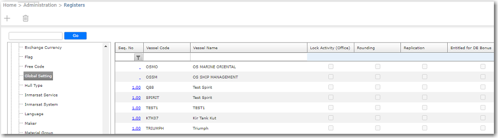 To define settings in the global settings register: 1. From the HR Manager main menu, click Registers under the Home - Administration sub menu. Then, click General, followed by Global Settings. 2. The Global Settings table will be displayed. 3. Every vessel in the System will be listed here. Select the check boxes as required for a vessel. The available check boxes are: