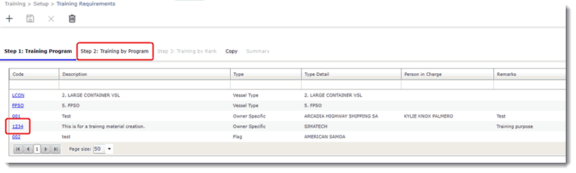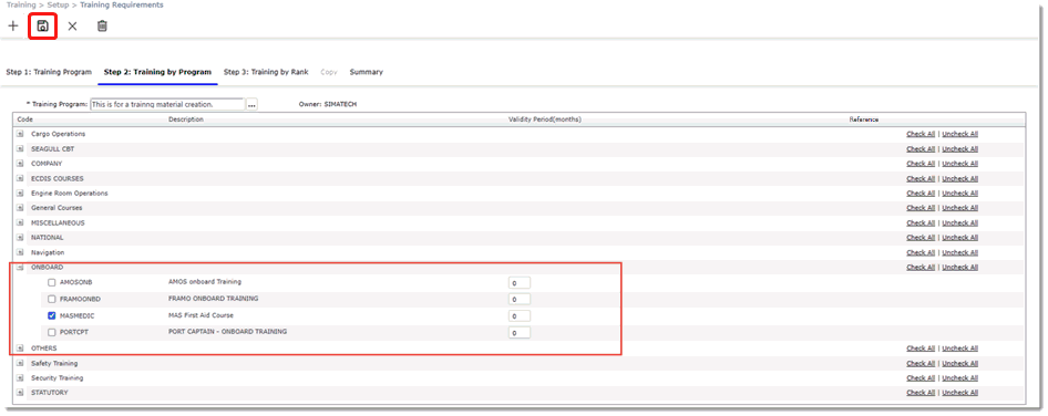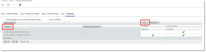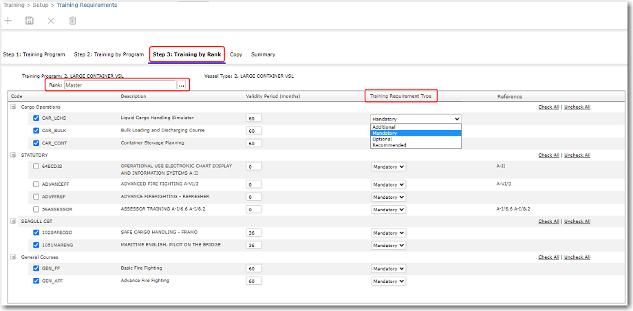 To define the training requirements: 1. From the HR Manager main menu, click Training Requirements under the Training module. 2. The Training Requirements screen will be displayed. Click the Step 1: Training Program tab. To begin creating a training course, click the + button. 3. Define the training details of the course you are creating by updating the applicable please. Ensure that mandatory fields (marked with *) are populated. 4. Check the Active check box to activate the training and allow them to be visible to the relevant crew members. 5. Once the fields are populated, click Save. 6. The newly created training program is now saved. To edit the detail of the training program, you can click the Code and proceed update and Save the record. 7. Click Step 2: Training by Program to proceed to the next step. 8. Click the locate (…) button to search for the training program created in Step 1. 9. Select the training program created in Step 1. 10. Click OK to proceed. 11. Select the category the training program belongs to. You can also set the Validity Period of the training program. Note: To select all training courses under a training group at one go, click the Check All link. Similarly, to deselect all training courses under a training group at one go, click the Uncheck All link. 12. Click Save. 13. Click the Step 3: Training by Rank tab to select the Ranks for which this training is required. Under the Step 3 tab, the system will only display training courses that have been selected under Step 2. 14. Click the lookup (…) button to search for the rank the created training course is applicable to. 15. Click the relevant rank, and click Select and OK. 16. Assign any additional training courses required for the particular rank. 17. Under Training Requirement Type, define the requirement type of the training. For example, the course could be Mandatory or it could be an Additional course for the rank. This will be used as indication when performing the Training Gap analysis. Note: Admin users can create more training requirement types, such as Optional, Recommended, and so on in the Training Requirement Type Register. The Validity Period column is used to specify the number of months a training course is valid for the selected rank. The Reference column provides the Standards of Training, Certification, and Watchkeeping for the training course, if any. 18. Under the Copy tab, select either the Copy All or Copy by Rank tab to copy the created training requirements to another vessel or rank type. 19. Depending on the tab selected, click the vessel or rank you want to copy the training program to, and click Select and OK. 20. Click the Save button once you have made your selection. A message will appear for your confirmation to proceed. Click Yes. 21. Move on to the Summary tab. Under this tab, you can view the entire training requirements setup that you have carried out in a matrix format. The training requirements that will be displayed in this matrix are for the Type that you have selected under the Step 1 tab. Note: Click Training and/or Rank to sort the training and/or rank by ascending or descending order.
