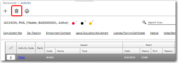Note: Alternatively, on the Activity screen, highlight the crew member's activity record that you want to delete. Click the Delete button at the top-left of the screen.