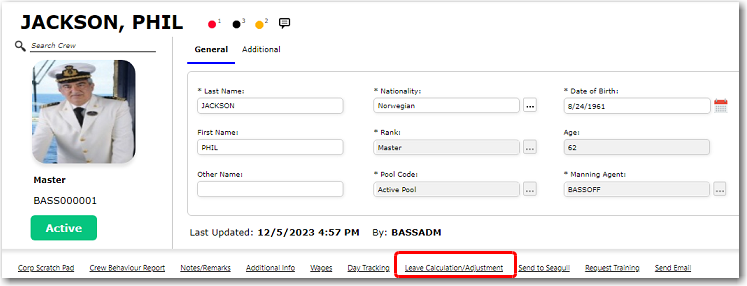 3. After you have loaded the crew profile record, click the Leave Calculation/Adjustment link.
