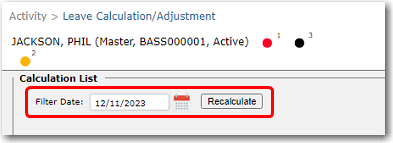 4. The Leave Calculation/Adjustment screen will be displayed. Use the Filter Date field to search for the crew member's leave records. Click Recalculate. Leave records will be displayed based on the entered date, for instance if you enter 12/11/2023 then all leave earned prior to that date will be displayed.
