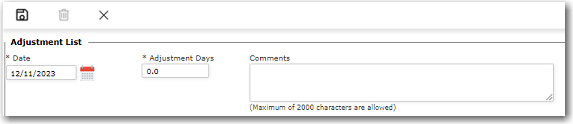 Note on B/F vs C/F: 'Brought Forward' displays the history of all leave days that have been brought forward since the beginning while 'Carried Forward' displays the number of leave days carried forward for a calendar year. 5. Click New and use the Adjustment List section to make adjustments to the number of leave days. From the Date field, select a date for which the adjustment is to be made, enter the number of days to adjust in the Adjustment Days field and then enter Comments relating to why this adjustment is being made.