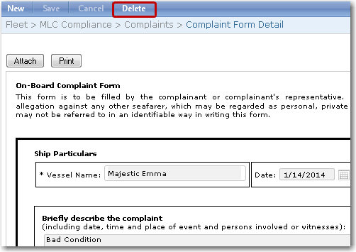 4. The selected crew member's complaint details will then be displayed. Click Delete at the top of the Complaint Form Detail screen. Click Yes to confirm your intention to delete the selected record and it will then be removed.
