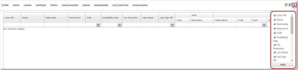 for crew members of a particular rank/s. Click the '+' icon to display a