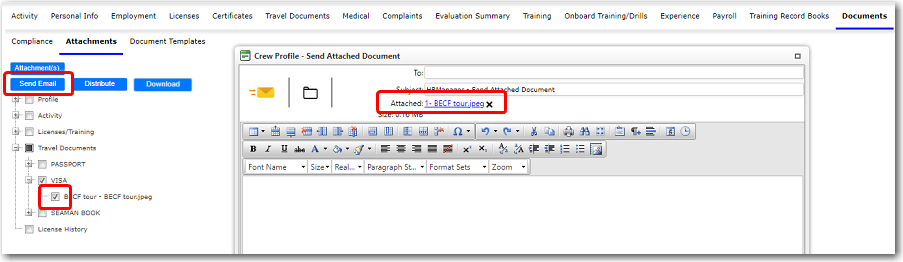 3. After you have loaded the crew profile record, click the Attachments sub tab under the Documents tab.