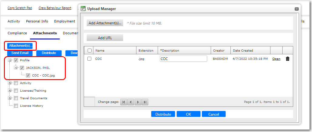 2. Ensure that the crew profile of which you want to view attachment details has been loaded. Use the Personnel search field to search and select the relevant crew profile.