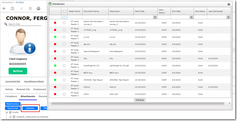 7. To distribute documents to other vessels, manually select the relevant documents and click the Distribute button. In the Distribution pop-up window, use the Filter Row to search for the relevant documents. Select the check box of each document that you want to distribute, then click Distribute. The documents will then be replicated over to the selected vessels during the next replication exercise.