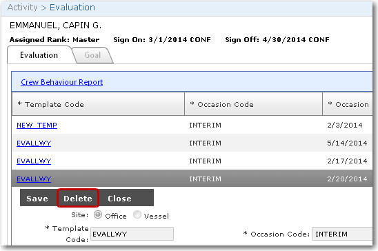 5. The selected crew member's evaluation details will then be displayed. Click Delete. Click Yes to confirm your intention to delete the selected record and it will then be removed.