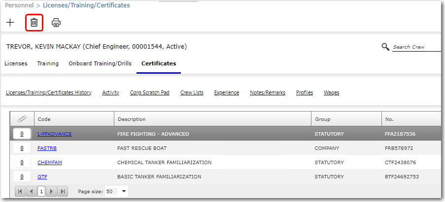 Note: Alternatively, without clicking the certificate code, on the Licenses/Training/Certificates screen, highlight the crew member's certificate record that you want to delete, and then click the trash bin icon at the top of the screen.