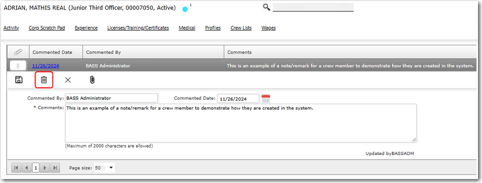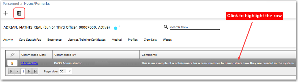 Using this feature, you can delete notes or remarks that were previously created for a crew member.