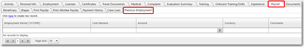 3. After you have loaded the crew profile record, click the Previous Employment sub tab under the Payroll tab.