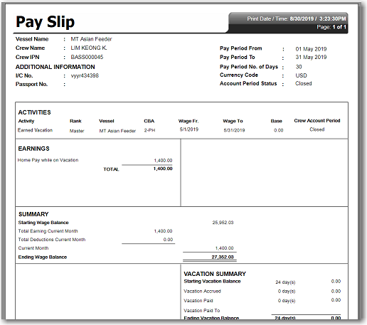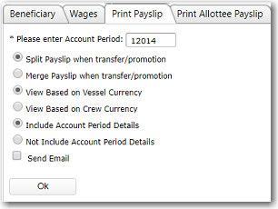 This feature enables you to print out a crew member's payslip based on an account period.