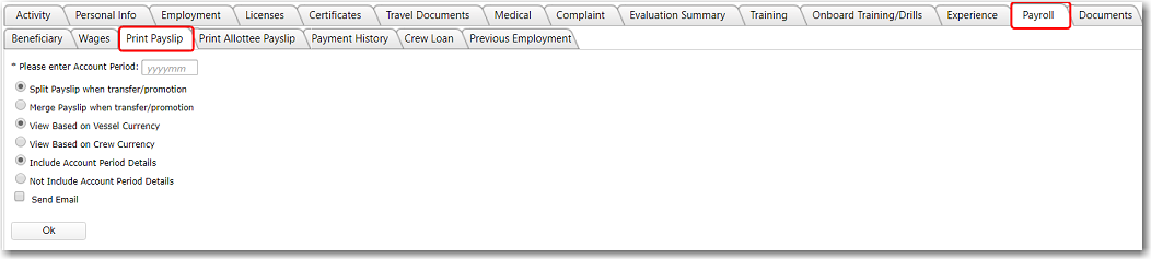 3. After you have loaded the crew profile record, click the Print Payslip sub tab under the Payroll tab.