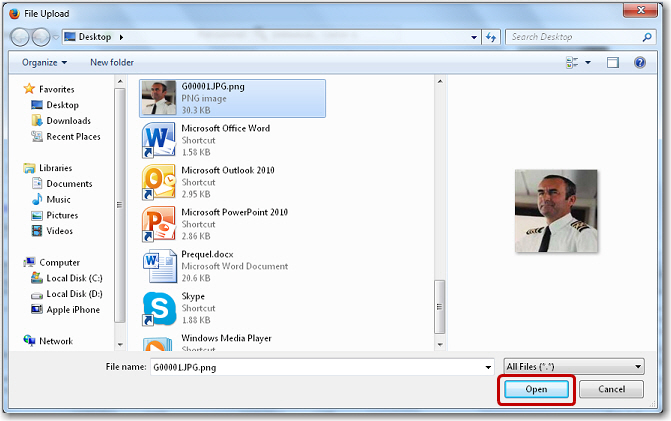 To attach a profile photo to a crew profile: 1. On the Profiles screen, ensure that the crew profile to which you want to attach a profile photo has been loaded. Use the Personnel search field to search and select the relevant crew profile. 2. Mouse-over the profile photo placeholder and an Upload link will be displayed. Click the Upload link. 3. The Upload Profile Picture pop-window is displayed. Click the Select button. 4. The File Upload window is displayed. Here, browse through your directories and select the profile photo file that you wish to upload and then, click Open. 5. The file path will then be displayed in the Upload Profile Picture window. Click Upload. Note: Click Remove to remove the selected profile picture. 6. The profile photo will be uploaded and displayed in the profile photo placeholder. 7. Click Save at the top of the page to save the changes you have made to this record. The profile photo you have attached will not be saved if you do not click the Save button. Note: If you want to change or delete the uploaded profile photo, mouse-over the photo placeholder and click Clear. This removes the current photo. You can then follow the instructions listed above to upload a new photo.