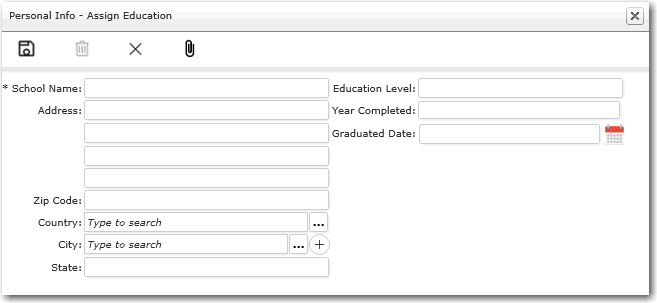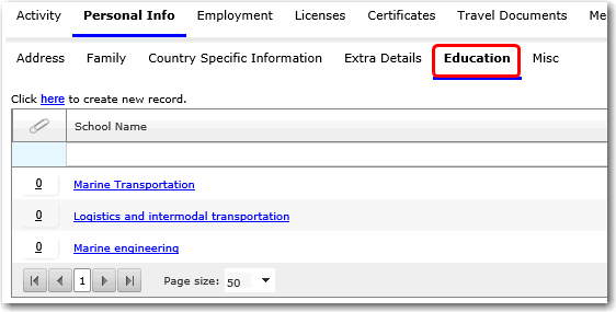 To enter details of the crew member's education history: 1. On the Profiles screen, ensure that the crew profile to which you want to add education information has been loaded. Use the Personnel search field to search and select the relevant crew profile. 2. After you have loaded the crew profile record, click the Education sub tab under the Personal Info tab. 3. Click the 'Click here to create new record' link to create a new education record. On the Personal Info - Assign Education window, enter information in the following fields: