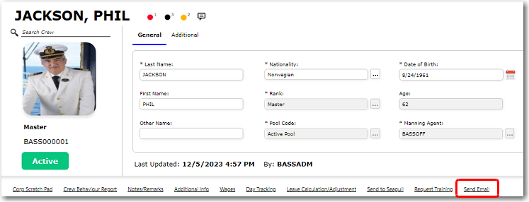 2. Ensure that the profile of the crew member to which you want to send an email has been loaded. Use the Personnel search field to search and select the relevant crew profile.