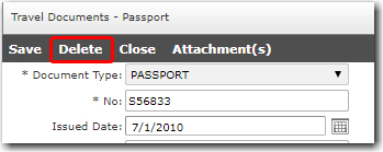 To delete a previously created travel document record: 1. From the HR Manager main menu, click Profiles under the Personnel menu. 2. Ensure that the crew profile for which you want to delete the travel document record has been loaded. Use the Personnel search field to search and select the relevant crew profile. Note: To use a previously saved list of crew, click the search icon in the Personnel search field to use the Personnel List feature on the Simple Search window. Use the drop-down function to select and load a list from the Personnel List section and click a crew member from the Search Result section to view his profile. 3. After you have loaded the crew profile record, click the Passport, Seaman Book, Visa or Vaccination sub tab under the Travel Documents tab. Click a particular record that you want to delete. 4. The selected crew member's travel document details will then be displayed. Click Delete. Click Yes to confirm your intention to delete the selected record and it will then be removed from the table.