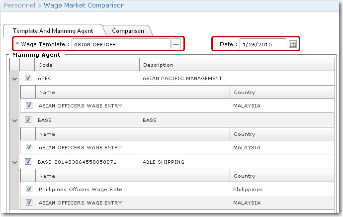 2. Under the Template and Manning Agent tab, select a Wage Template and a Date. The manning agents who have used the selected wage template to create wage market rate records will then be displayed in the Manning Agents section.
