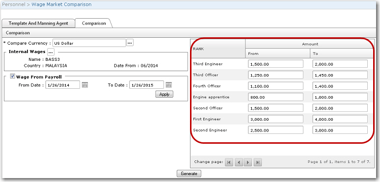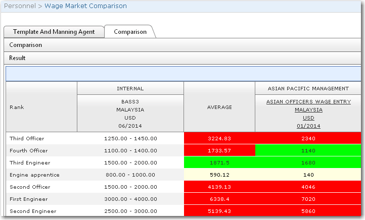 5. Click Generate. In the Result section, the screen will display a comparison of your company's wage rate versus the wage rate paid by other companies. If the other companies' wage rates are higher than your company, it will be highlighted in red. Green indicates that the wage rate is within your company's wage range or equal to it. White indicates that your company's wage rate it higher than the other company's rate.