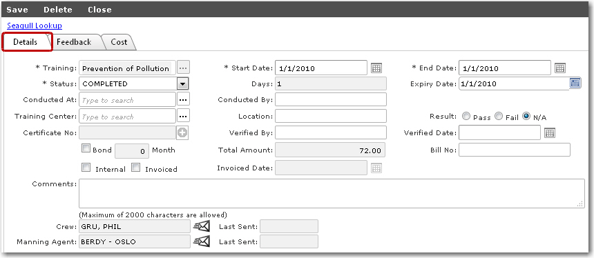 4. The selected crew member's Licenses/Training screen will then be displayed. Under the Details tab, you can view and edit the following training information:
