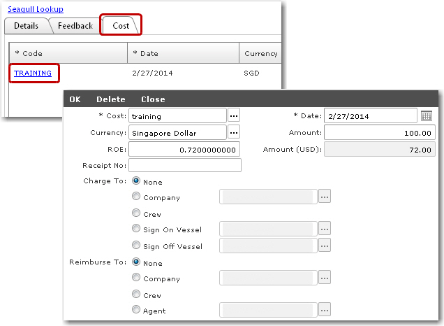 6. Move on to the Cost tab to view and edit the costs of the training. Click a cost record to view and edit the Cost, Date, Currency, Amount of the training and so on.