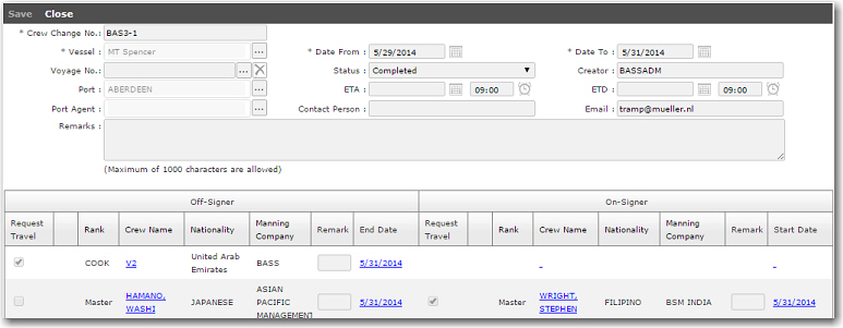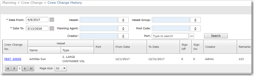 This feature enables you to view all past crew change records that have been created in the System. No changes can be made to the records displayed on this screen.