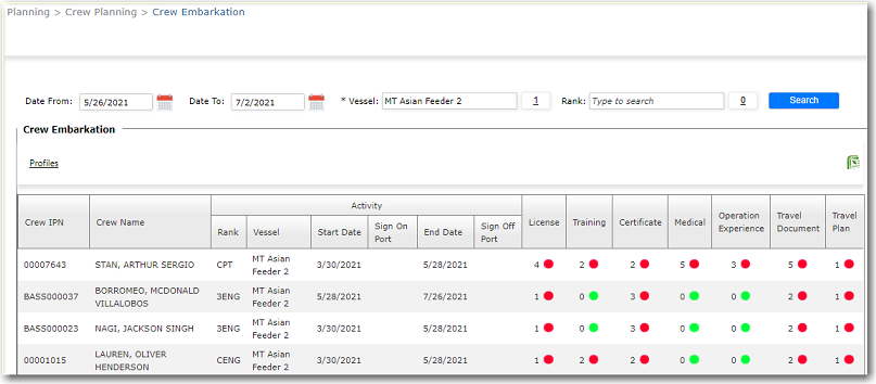 This sub module serves as an automated checklist enabling you to verify that the crew members meet all the necessary requirements before signing on to a vessel. Enter a range of dates within which you want to perform a check and a list of crew who are to sign on within that time period will be displayed. You can then use this feature to quickly see the verification status of the crew member’s License, Certificate, Medical, Operation Experience, Travel Documents and Travel Plans. A 'green' indicator shows that the verification has been completed while a ‘red’ indicator shows that the particular records have not yet been verified.