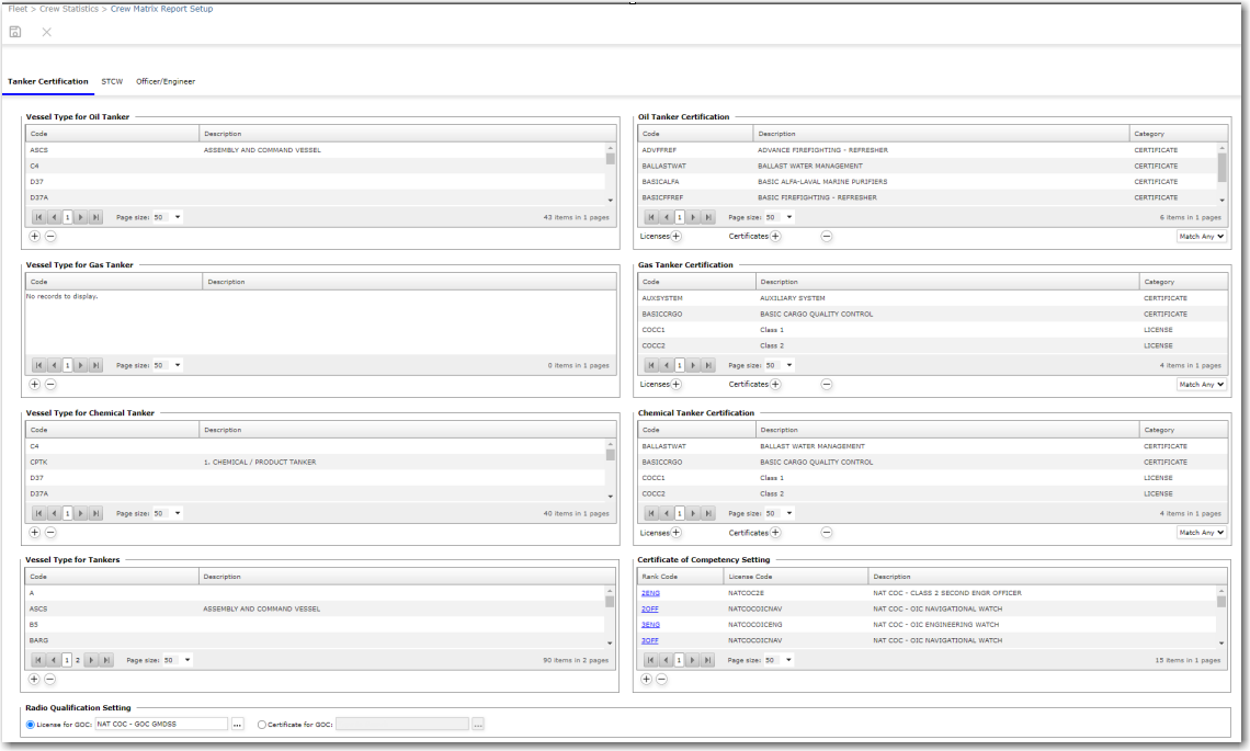 In these tables, you will need to define the vessel types that fall under Oil, Gas and Chemical Tankers. Then, add Licenses and Certificates that are required for the particular tanker certification. If the vessel you select when generating the report has been categorized under 'Oil', 'Gas' or 'Chemical', the Tanker Certification field in the report will display either an 'O', 'G' or a 'C' respectively.