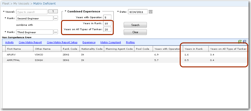 To generate a list of non-competent crew: 1. From the HR Manager main menu, click Crew Matrix under the Fleet menu. 2. The Crew Matrix screen is displayed. Click the Matrix Deficient link. 3. In the Vessel table, click in the field and select the vessel/s for which you want to carry out a competence check. To remove a vessel from the table, click the numeric box and then clear the check boxes of the vessels you don't want to include. You may select more than one vessel. 4. In the Rank fields, select the combination of Ranks for which you want to check the competence levels. Use the Lookup function to select the Ranks. If the crew members who are holding either one of the selected Ranks, when combined with the other selected Rank, do not meet the Combined Experience required, will be listed in the Non-Competence Crew table below. 5. In the Combined Experience section, enter the combined experience that is required for Years with Operator, Years in Rank and Years on All Types of Tankers. 6. Enter the Date (usually a date when the crew members were onboard the selected vessels). 7. Click Search. Crew Members holding either one of the combined ranks who do not have the adequate number of years of experience required will be listed in the Non-Competence Crew table. This indicates that even when the two ranks were combined, they would still have an inadequate number of years of experience as required in the Combined Experience section.