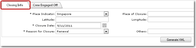 To close a crew agreement for a vessel: 1. From the HR Manager main menu, click EDI to MPA under the Fleet sub-menu. 2. The EDI to MPA screen will be displayed. From the screen, click the Closing of Crew Agreement link. 3. The Closing of Crew Agreement screen is displayed. Use the Fleet search field to search and select the Vessel for which you want to close a Crew Agreement. The results of your search will be displayed on the screen. 4. Click New and then enter the following details under the Closing Info tab: