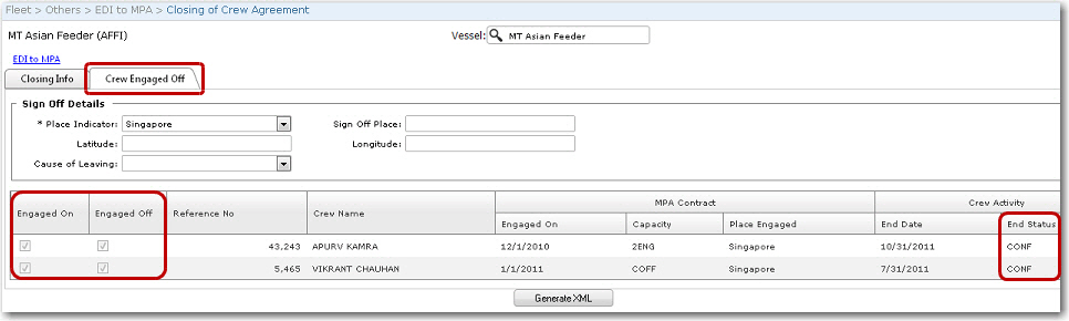 5. Click the Crew Engage Off tab. The list of crew members who are currently onboard the Vessel will be displayed. Before you can sign off any of the crew members, you must ensure that their End Status under the Crew Activity header has been set to 'Confirmed'. Select the check boxes of all crew members signing off, under the Engaged On and Engaged Off columns. 6. Click the Generate XML button to save and generate the agreement to an XML file which can later be sent to the MPA. Your record will now be successfully saved. 7. Click the EDI to MPA link from the screen and then, on the EDI to MPA screen, you will be able to see a summary of this contract.