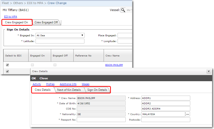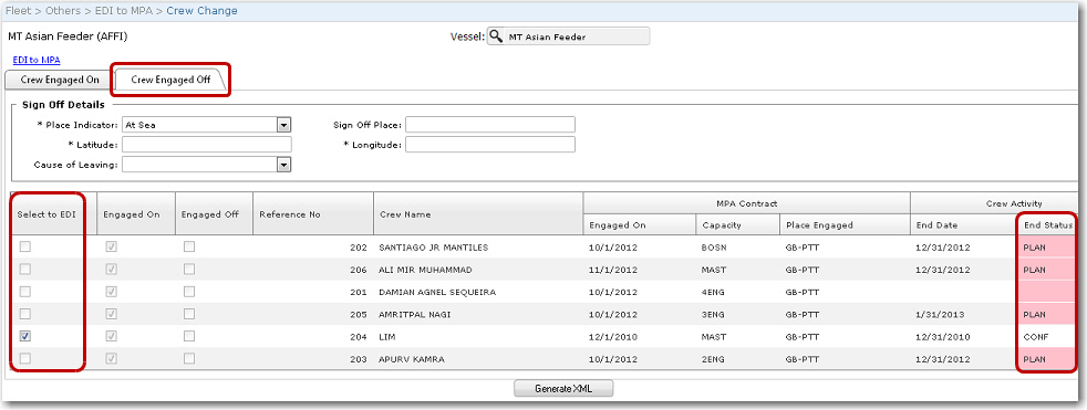 Screen Navigation: Fleet - Others - EDI to MPA - Crew Change link