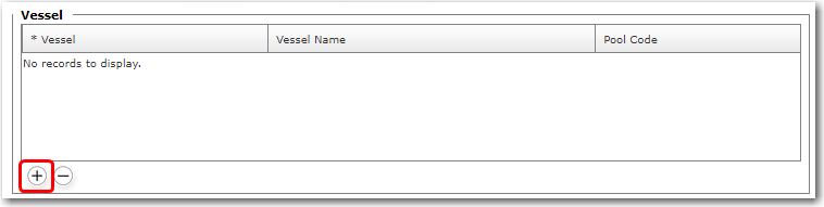 3. Move on to the Vessel table. Click the '+' icon at the bottom left of the table to select a vessel for which this rotation planning is being carried out. From the Vessel pop-up window that is displayed, select the appropriate vessel. Click OK to close the window. The Vessel will then be displayed in the table.