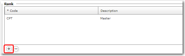 4. In the Rank table, you will now need to select the Rank for which you want to plan the rotation. Click the '+' icon at the bottom left of the table to select a Rank for which this rotation planning is being carried out. From the Rank pop-up window that is displayed, select the appropriate Rank. You may select more than one Rank for which you want to perform rotation planning. Click OK to close the window. The selected Ranks will then be displayed in the table.