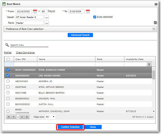 Next you will need to search and select the personnel for each Rank. Click the rank and click Best Match or Crew Search. The relevant pop-up window will be displayed with the search criteria automatically loaded. Use the relevant search filter criterias to find suitable crew. Selec the personnel's check box and click Confirm Selection. The selected personnel will then be displayed in the Selected Crew table. Note: If the required number of crew for the particular Rank is '1', you may want to select at least '2' crew members that you can rotate for this Rank position. * Repeat this process for each Rank listed in the Vessel's Rank table.