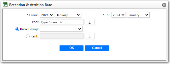 To generate an overview of your staff retention & attrition rate for a particular period: 1. From the HR Manager main menu, click Staff Strength under the Planning menu. 2. The Staff Strength screen is displayed. 3. Click the Retention & Attrition Rate link. 4. The Retention & Attrition Rate pop-up window will be displayed where you can specify a time period and the Pool for the search. Then select either the Rank Group filter or the Rank filter.