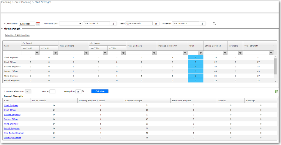 Using this feature you can see an overview of your fleet strength, i.e. total staff onboard vs staff on vacation based on a certain date. You can also calculate your staff surplus or staff shortage based on your fleet size. This information can also be exported to a Microsoft Excel file. A feature to track your staff retention rate during a particular period is also available in the System.