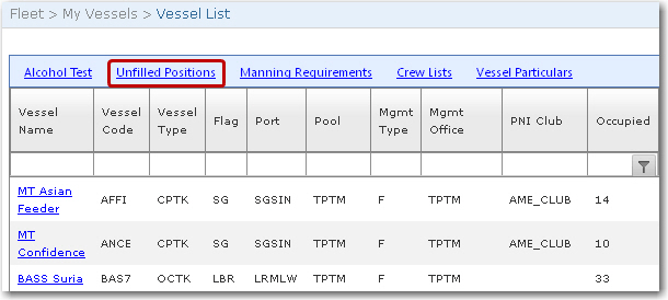 Screen Navigation: Fleet - Vessel List - Unfilled Positions link - By Fleet tab