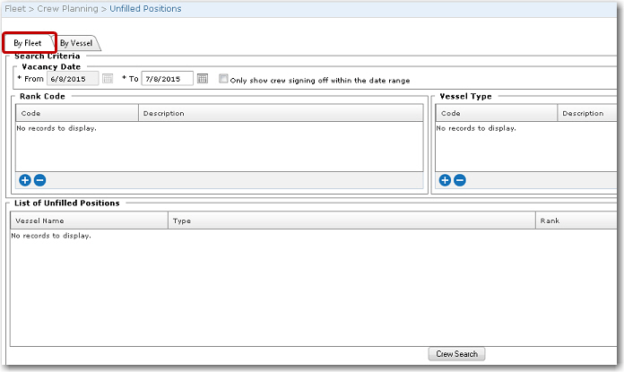 To search for available positions onboard vessels in your fleet: 1. From the HR Manager main menu, click Vessel List under the Fleet menu. 2. On the Vessel List screen, click the Unfilled Positions link. Note: You can also open the Unfilled Positions screen by clicking the Unfilled Positions link on the Fleet - Crew Planning - Planning Overview screen. 3. The Unfilled Positions screen will be displayed. Under the By Fleet tab, you can specify your search criteria to locate the unfilled positions across your fleet: