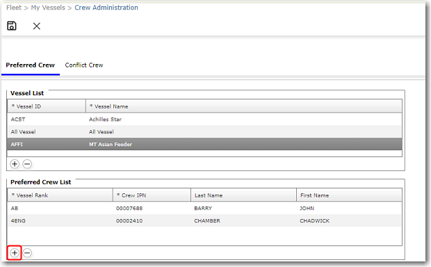 To create a Preferred Crew List: 1. From the HR Manager main menu, click Crew Administration under the Fleet menu. The Crew Administration screen is displayed. 2. Under the Preferred Crew tab, select the vessel from the Vessel List, or click the + icon to add a vessel from the system. Existing preferred crew will appear below. (You can also select All Vessel, which will then include the selected crew regardless of which vessel is selected. Crew selected in All Vessel will not be able to select in individual vessels.) 3. In the Preferred Crew List section, click the + icon to add crew to the list, and - icon to remove the crew from the list. 4. Click Save to save the changes.
