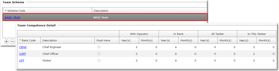 table to select the applicable team scheme for this vessel.