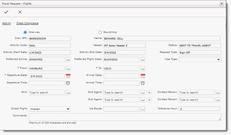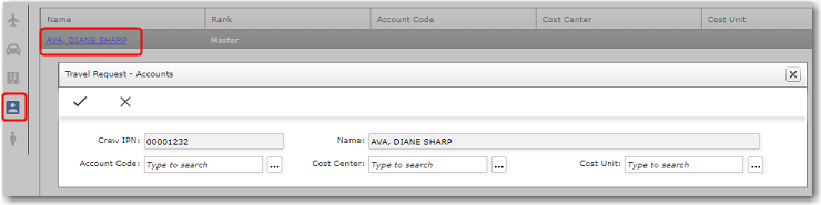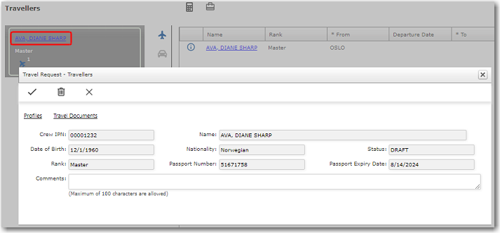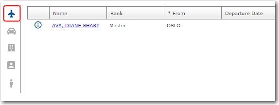 Note: When viewing the details of the traveller, you can also click the Profiles or Travel Documents link to view their profile or check the validity of their travel documents, respectively. 8. On the right panel, click the Plane icon to display the Flight arrangements. 9. To update a flight arrangement, click on the Name to open the flight details for that crew member.