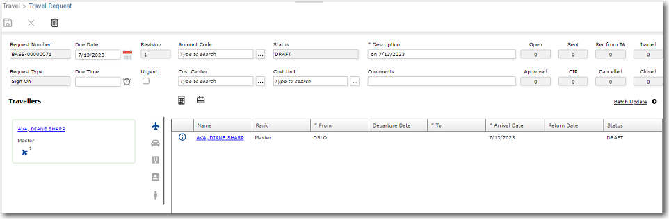 Note: You cannot add a traveller/crew member to an existing travel request. To add a crew member, you would need to delete the existing request and then create a fresh request.