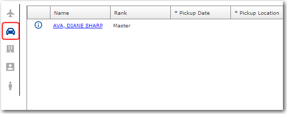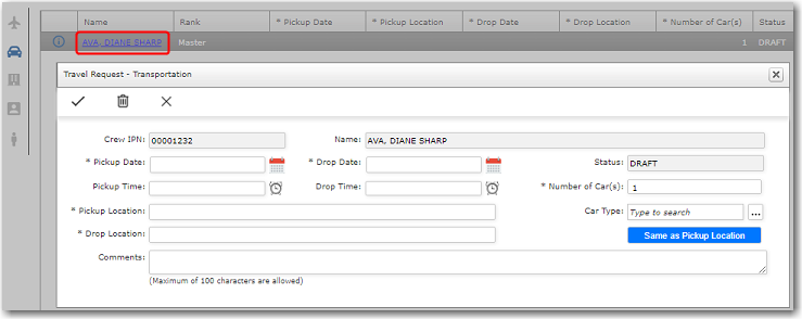 Click OK (the tick icon) to save the flight details. 10. To make Transport arrangements, click the Car icon. 11. Click the + icon below to add transport requests and select the relevant traveller. 12. Then, click the Name to open and update the details of the transportation.
