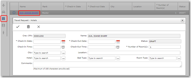 Click OK (the tick icon) to save the transport details. 13. To make Hotel arrangements, click the Hotel icon. 14. Click the + icon below to add accommodation requests and select the relevant traveller. 15. Then, click the Name to open and update the details of the accommodation.